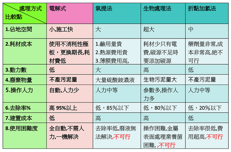 緣此本公司特別研發氨氮電解機,針對有氨氮處理困擾的廠商提供一個最佳的解決方案,其原理乃是利用電流在極板產生的氧化作用來強力氧化氨氮,具有操作簡單,用地面積小,設備成本低等優點;其特色和優點與其他的處理方法利用下表比較如下: